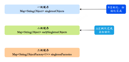 - 同样,B 注入属性时发现依赖 A,就从缓存中找 A 对象。依次从一级到三级缓存查询 A。