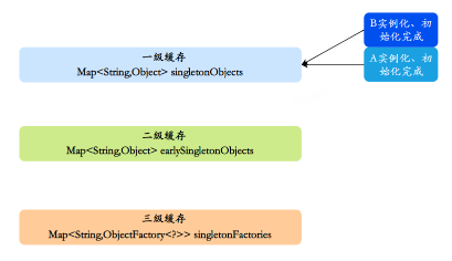 - 接着 A 继续属性赋值,顺利从一级缓存拿到实例化且初始化好的 B 对象,A 对象初始化完成,删除二级缓存中 A ,同时把 A 放入到一级缓存。
