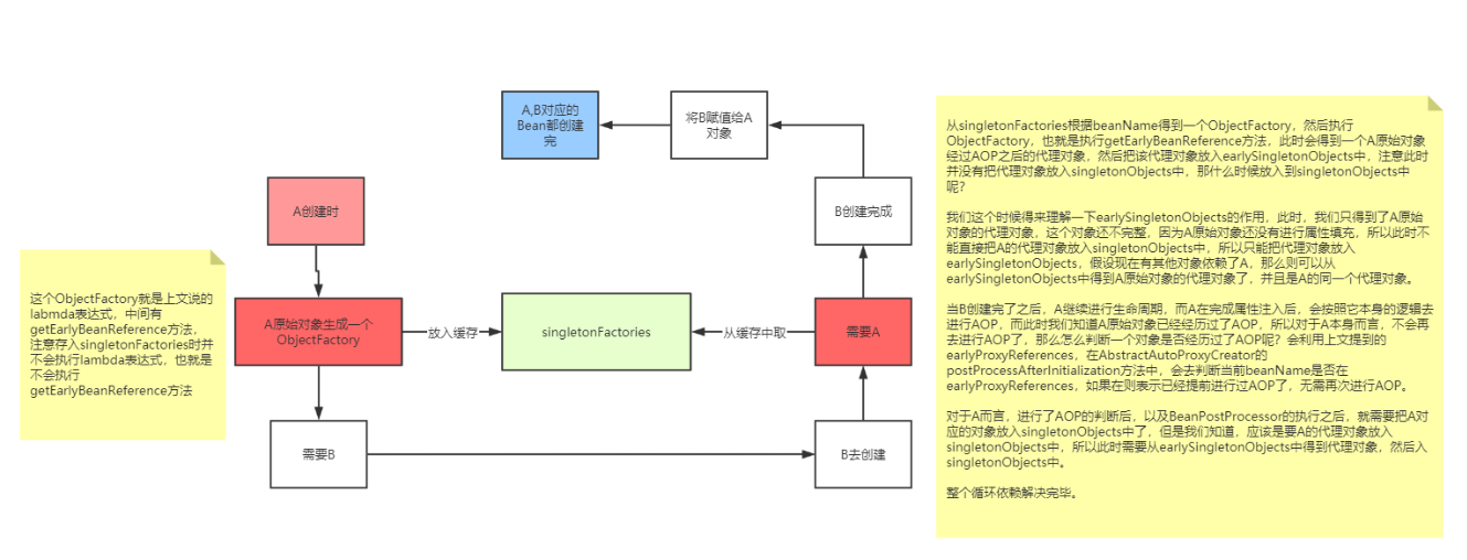 - 其实还有一个缓存,就是earlyProxyReferences,它用来记录某个原始对象是否进行过AOP增强,如果进行了增强,那么在循环依赖的时候,需要把earlyProxyReferences中的对象也拿出来放到二级缓存中
