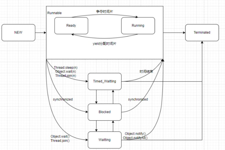 - RUNNABLE(可运行):线程对象被创建后,调用start()方法,线程处于就绪状态