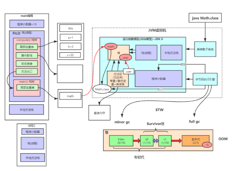 - 虚拟机栈:方法执行时,每个方法都会创建一个栈帧,用于存储局部变量表、操作数栈、动态链接、方法出口
